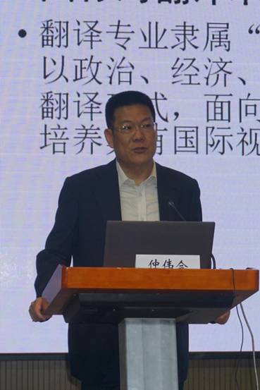 协作组组长仲伟合教授做“高校翻译专业教育:反思与发展”主旨发言,他总结了我国翻译专业教育成就,提出翻译专业教育进入本地化发展阶段的理念;指出我国翻译专业教育存在的八大问题,对我国翻译专业教育未来发展提出五点思路,即人才培养是中心、科学技术要辅助、专业特色是关键、国际交流是保障、服务国家是目的,并对国标背景下我国翻译教师专业能力发展和翻译专业课程建设给出具体建议。