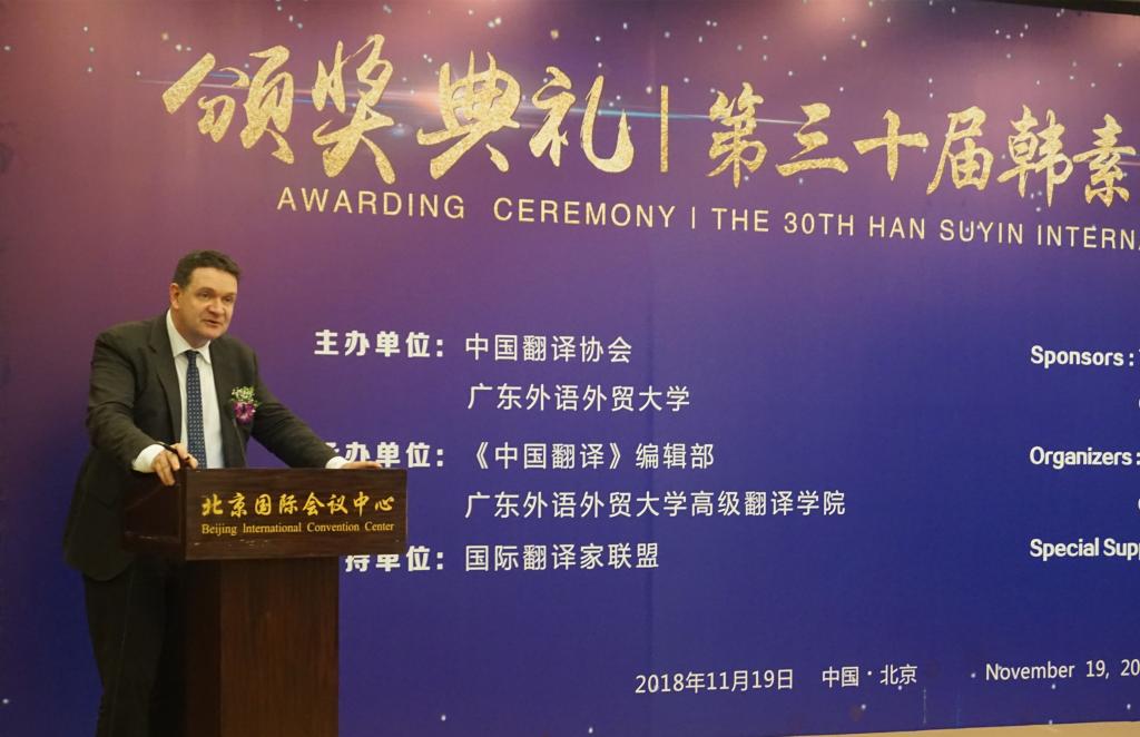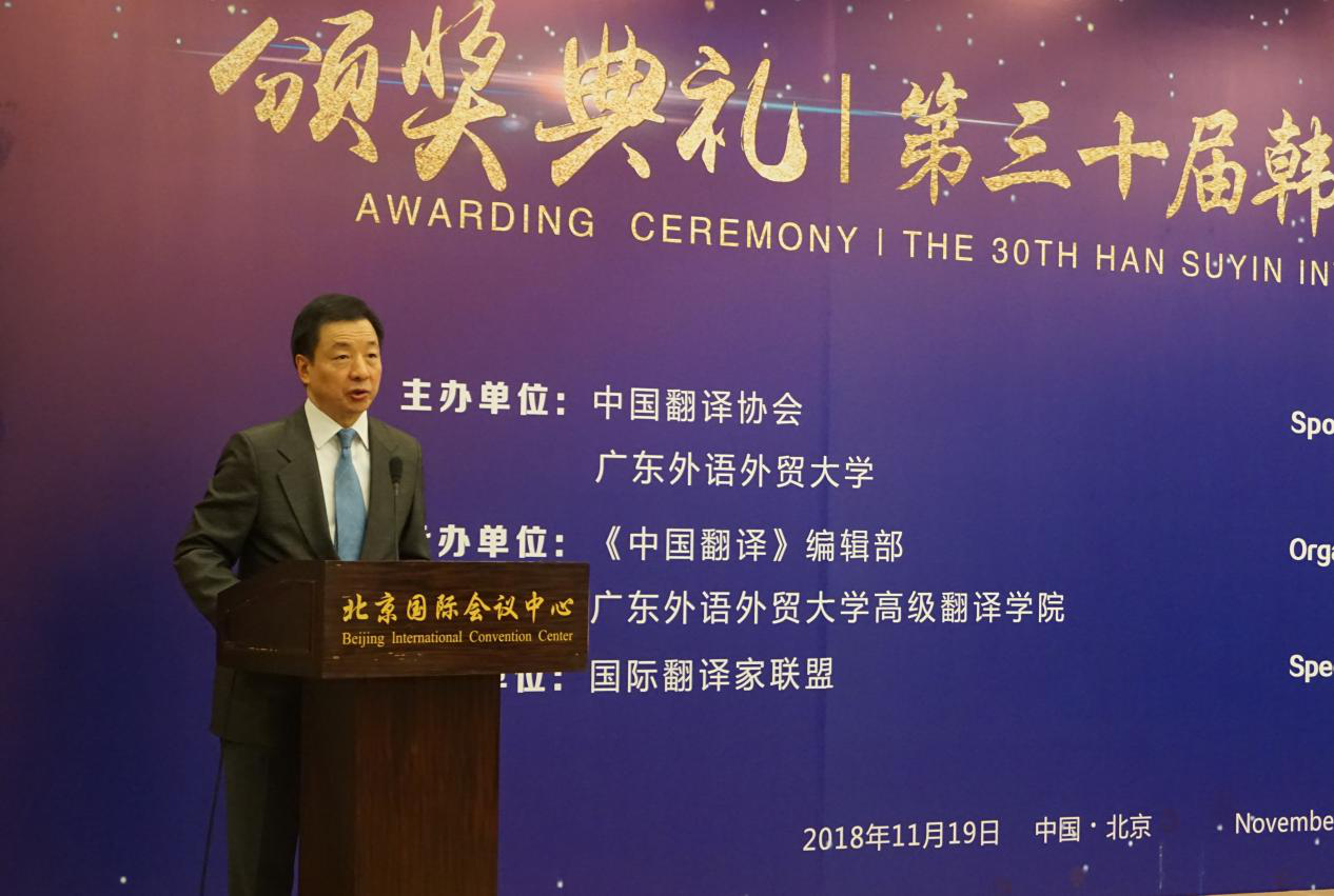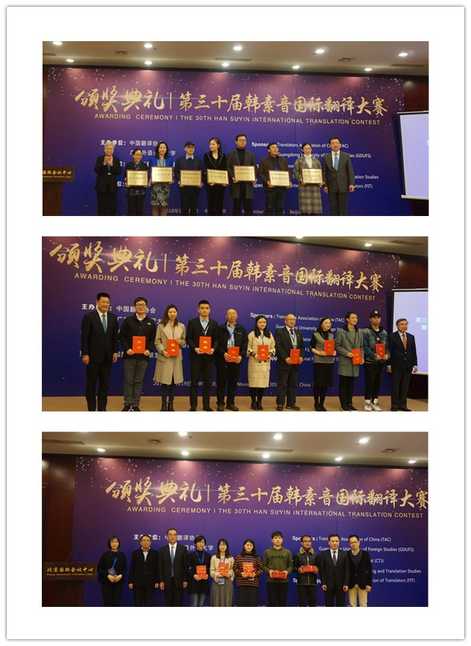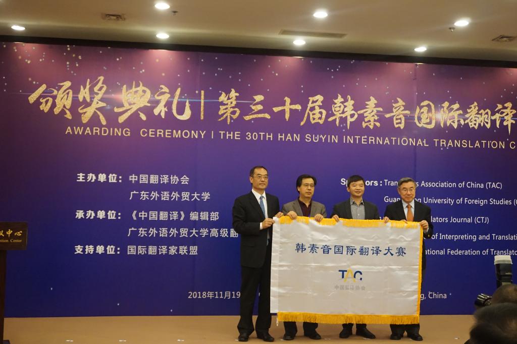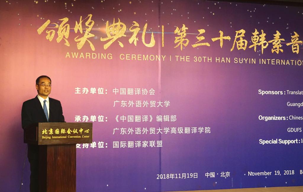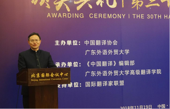 2018年11月19日下午,“第三十届韩素音国际翻译大赛”暨“我与‘韩奖’竞赛征文”颁奖典礼在北京国际会议中心举行。该赛由中国翻译协会和广东外语外贸大学联合主办、《中国翻译》编辑部与广东外语外贸大学高级翻译学院联合承办。